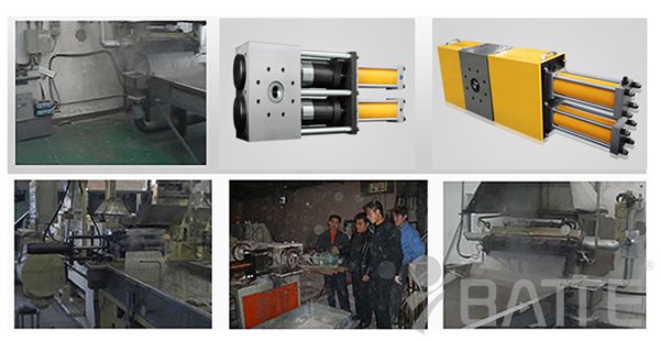 (2)小型的拉條冷切造粒工藝一般都用多網往復過濾的換網器(如:可采用雙柱四工位液壓換網器雙柱四工位反沖洗液壓換網器),因為它帶穩壓及自動排氣機構,換網時不停機、不斷條、不影響正常生產,粒子光滑無氣泡。口模與換網器一體化設計制造,合理、經濟、實惠!